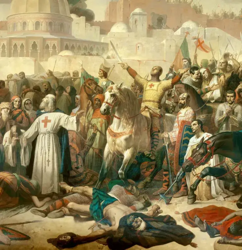 When the Crusaders at last reached Jerusalem, the city shone before them like a mirage, her walls crowned by the dawn. The march had taken three years; half of those who had left the fields of Europe lay buried beneath strange skies. But the faithful pressed on, barefoot upon sacred soil, singing psalms as arrows fell like rain. The tenant — now a knight by deed if not by title — was among the first to breach the gate. His sword, once dull with rust, gleamed with divine fire. The siege was fierce and terrible. He scaled the walls with Godfrey’s men, his arms trembling but his soul alight. Arrows rained down, the stones burned, and yet the cross rose higher. When the city fell, he entered barefoot, walking through tears and ashes, until he reached the Church of the Holy Sepulchre. There he knelt, his sword laid across the altar, and whispered,